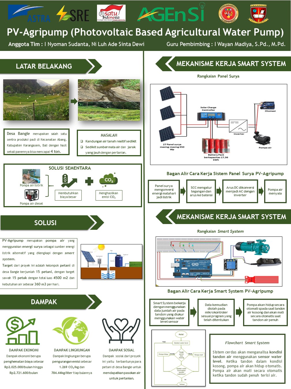 PV-AGRIPUMP merupakan inovasi pompa air yang menggunakan tenaga surya sebagai sumber energi alternatif. Inovasi ini dilengkapi dengan smart system berupa sensor water level dan mikrokontroler yang dapat mrngatur nyala dan mati pompa secara otomatis.