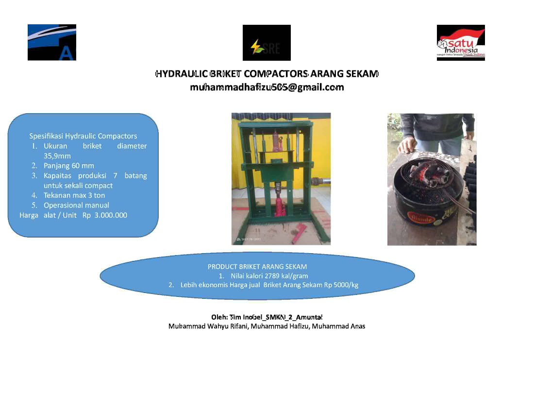 Hydraulic Briket compactor adalah alat pencetak dan pemadat adonan briket arang sekam. Proses Compact menggunakan System hydraulic dengan hasil 7 Batang untuk sekali Compact. Product briket dapat langsung d gunakan setelah d jemur 1 - 2 hari
